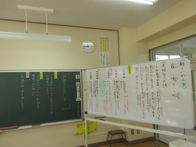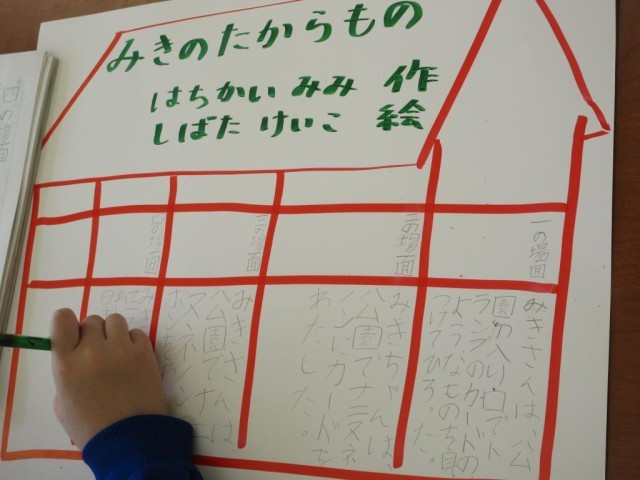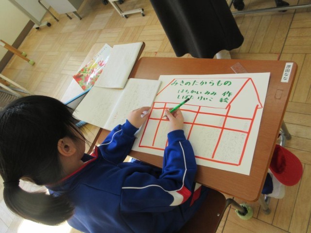 2年生は国語で物語「みきのたからもの」の読み取りをしています。今日は各段落の内容を短くまとめ、お話しの構成を一覧にする学習に取り組んでいます。よく読み取れていたようで、するするとお話の中身を短く書いていました。取り組みやすいように、お家の形をしたプリントに書き込めるように配慮しています。この後、自分でお話しを作る際に、構成を考える手助けともなります。