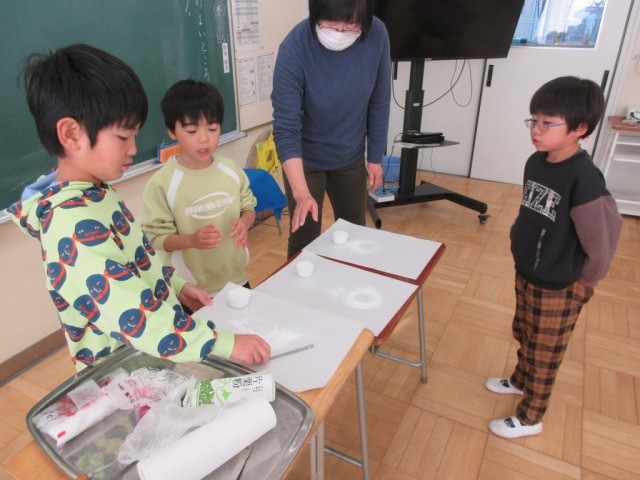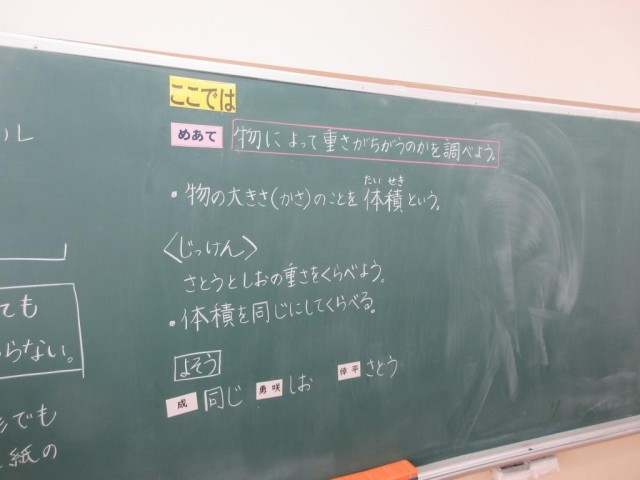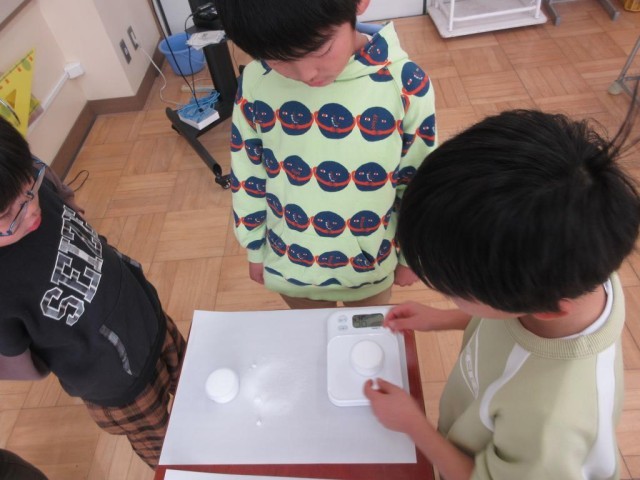 3年生は理科で重さの学習をしています。今日は体積が同じでも重さはちがうことを確かめるために、塩・砂糖・片栗粉を同じ大きさの容器に入れて、重さを量る実験を行いました。実験の前にそれぞれ、一番重いものを予想してから実験を開始しました。それぞれ重さがちがうことを確認し、「体積が同じでも、ものによって重さが変わる」とまとめていました。