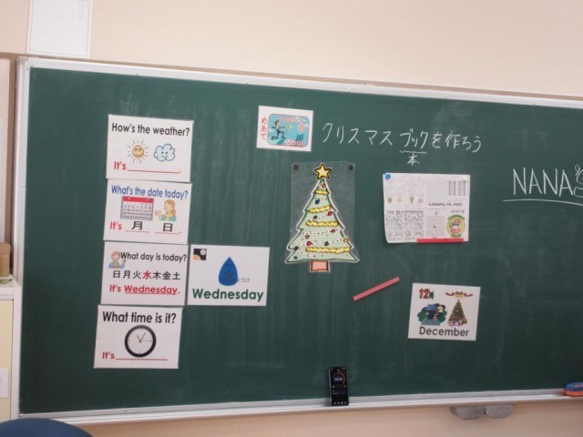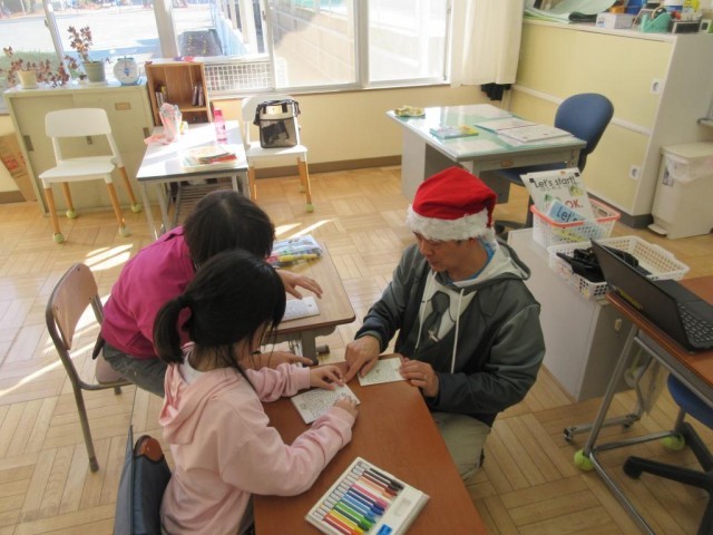 2年生は生活科で外国語の学習をしています。今日はALTの先生といっしょに、クリスマスクラフトに挑戦です。いろいろなイラストやゲームが1まいの紙に印刷されているプリントに、色を付けたり、英語で名前を書いたりして、折り重ねていくと、「クリスマスブック」ができあがりました。早速ALTの先生といっしょにゲームをしてみます。内容は間違い探しや迷路などで、取組ながら英語が学べるようになっています。ALTの先生からのクリスマスプレゼントとなりました。