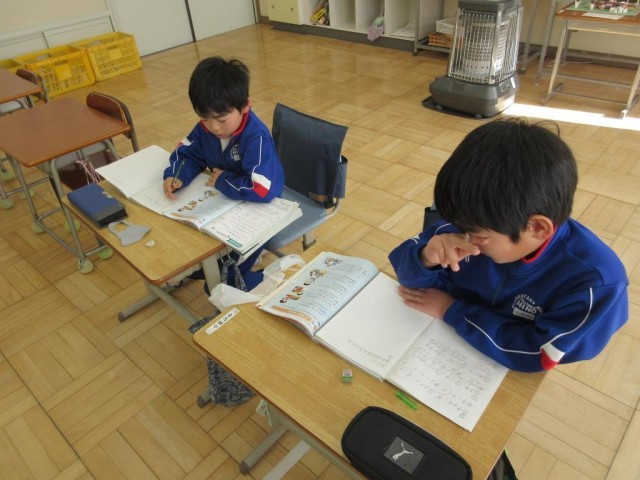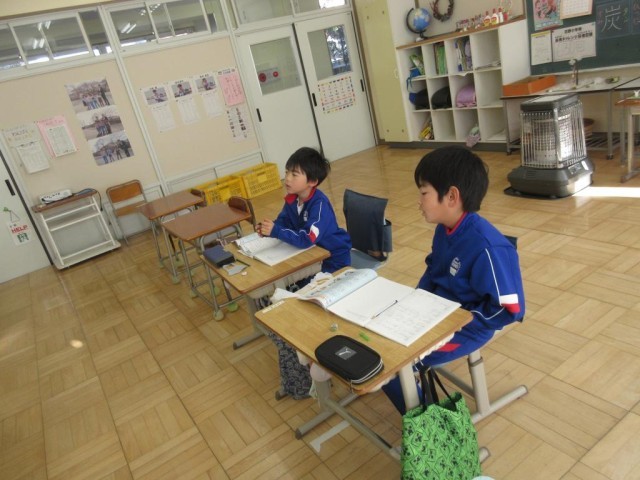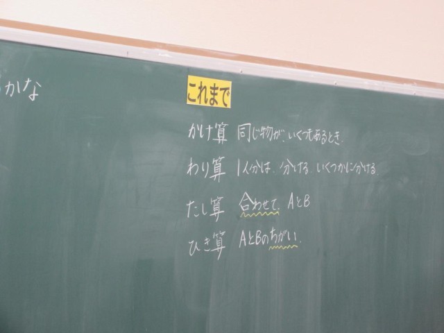 3年生は算数で、これまでの計算を振り返って、工夫して計算する学習に取り組んでいます。その前に、これまでにどのような計算を学習したかを確認していました。その中で、かけ算や、わり算がどのような計算なのかを先生に問われ、考え込んでいました。かけ算を言葉で表現するのに、ざるに入ったバナナを使って、「同じ数ずつ増える計算」であることを確認していました。その後、教科書の文章題に取り組んでいました。