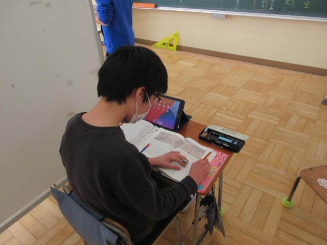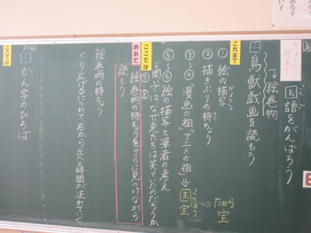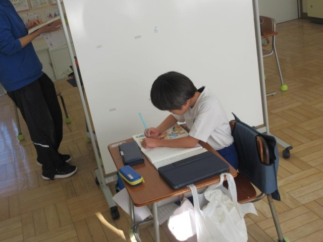 みかぼ学級では、国語の授業が行われていました。6年生は鳥獣戯画に関する説明文の読み取りで、まずは「絵巻物」とはどういものなのかを確認した後、見るものを引きつける工夫について文章中から抜き出していました。3年生は漢字の学習で「正しい」の読み方について、先生から「2+3=5はあってる」という問いかけに「あってる」と答え、その後先生から別な言い方できる、と問われ「ただしい」と答えていました。その漢字が「正しい」であることを確認していました。普段の生活で何気なく使っている言葉から漢字の学習を進めていました。