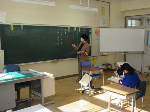 2年生は国語で「冬をさがそう」の学習をしています。冬にちなんだものやことを思い浮かべて言葉にしたり、冬にちなんだ詩を鑑賞したりします。冬にちなんだ言葉では、「冷たい」「雪」などを思い浮かべていました。学習の中で先生から、「冬は何月だろう」と聞かれ、「12月」と答えていました。併せて先生から1月と2月も冬の季節と言われているんだよ、と説明していました。季節感があまり感じられなくなってきましたが、あらためて季節のことを思い浮かべるとなんだか楽しい気持ちになりました。2年生の児童も楽しく国語の授業を受けています。