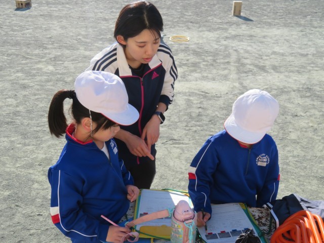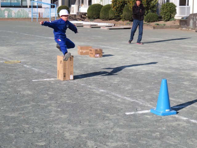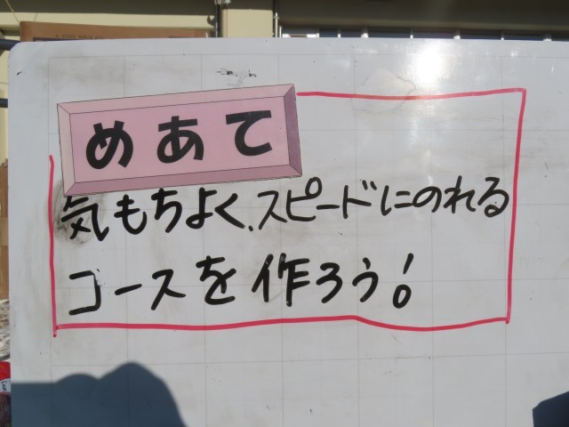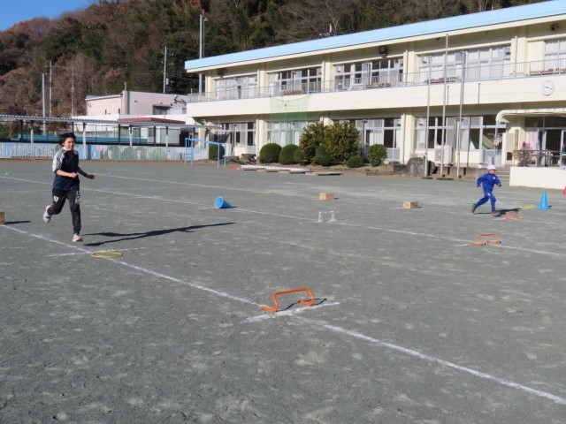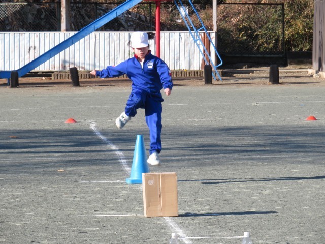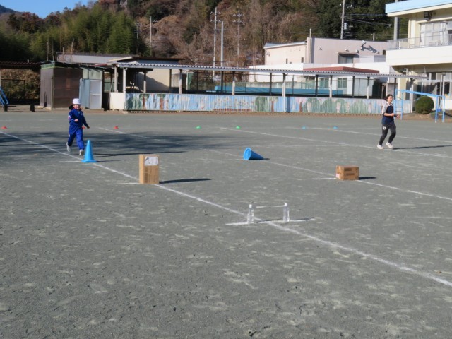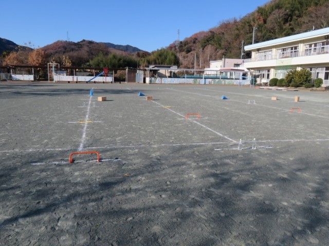 2・3年生は体育で「ミニハードル走」に挑戦していました。準備運動をした後、まずは、先生が用意した3m、3.5m、4m、4.5m間隔の4つのレーンの中から1つ選び、自分でダンボールやコーン、ペットボトル、ミニハードルなどの障害物を自由に置いてコースをつくりました。次に、今日のめあて「気持ちよくスピードにのれるコースをつくろう」を意識し、置く物を変えたり、高さを調節したりなどの工夫しながらコースをつくりかえ、友達や先生と対戦しました。最後に、自分が選んだ間隔と違うコースを走ってみて、気持ちよく走りこえられたコースはどこか、その理由は何かを考えていました。それにより、子どもたちは、「気持ちよく走りこえられるコースは、リズムが合う」ということをつかんでいました。この学習が、やがてハードル走の学習につながっていきます。