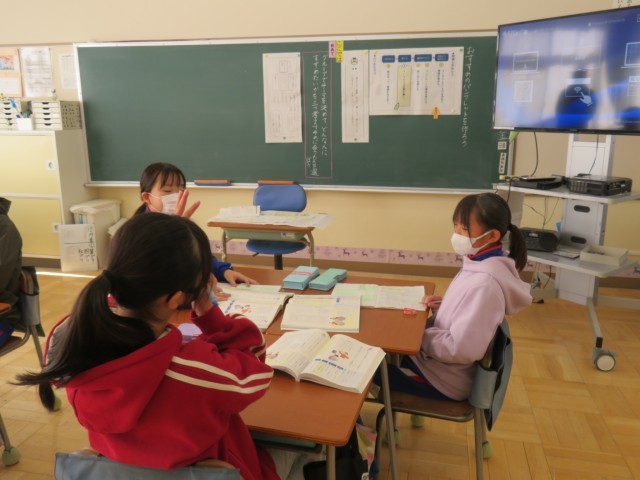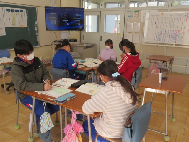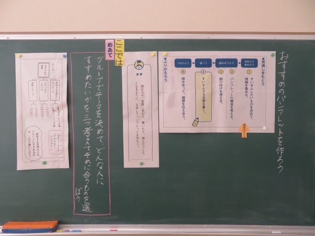 6年生は、国語でパンフレットづくりに挑戦です。今日は、おすすめのパンフレットを作成するためにテーマを決め、それをどんな人にすすめたいかを考えていました。教科書の例を参考に、一つのグループは「おすすめのアニメ」を、もう一つのグループは「おすすめの遊び」をテーマに設定し、具体的なアニメや遊びを出しながら、それをどんな人にすすめたいかを話し合っていました。自分たちが好きなものをテーマにしているので、具体例が次々と出てきていました。この後、構成や割り付けを考え、推薦する文章を書いていきます。どんなパンフレットができあがるのか、今から楽しみです!
