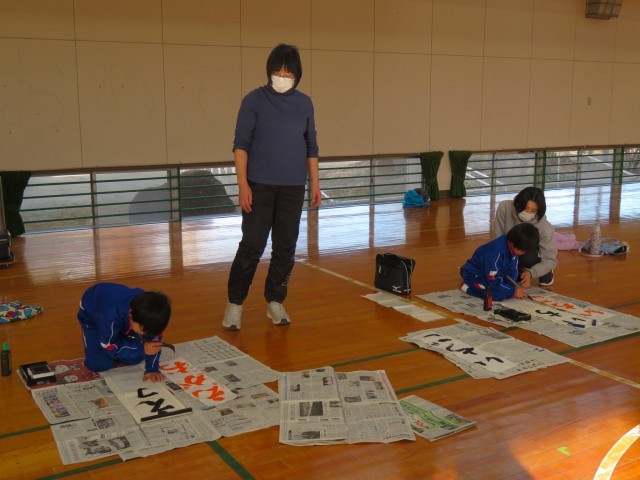 5・6校時は、体育館で書き初め大会を行いました。12月の練習の際に指導していただいた片山先生の「ゆっくり」「大きく」の言葉を思い出しながら、自分で考えた新春にふさわしい言葉を書きました。やる気に満ちたとても静かな空間の中で、一人一人が真剣に取り組み、すてきな作品を仕上げることができました。