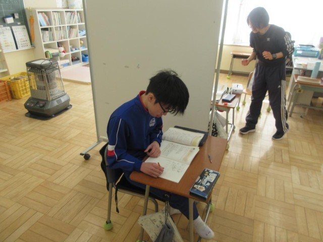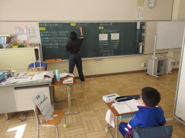 みかぼ学級では6年生が分数、3年生がかけ算の学習をしています。3年生のかけ算の学習では、かける数、かけられる数を「追いかける数」「追いかけられる数」と呼んで覚えやすくしていました。これまでの学習の確認の後、先生から児童に「今日のめあては何としようか」と問いかけたところ、自分の言葉で今日の学習のめあてを発言していました。主体的な学習が進められています。