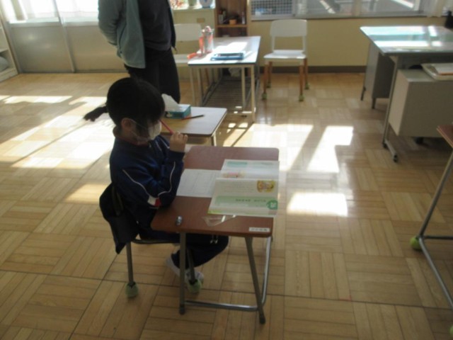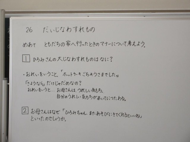 2年生は道徳でマナーについて考えています。お友達の家に行っておやつを食べてお礼を言い忘れてしまったお話を題材に、「ありがとう」を伝える大切さを先生といっしょに考えていました。