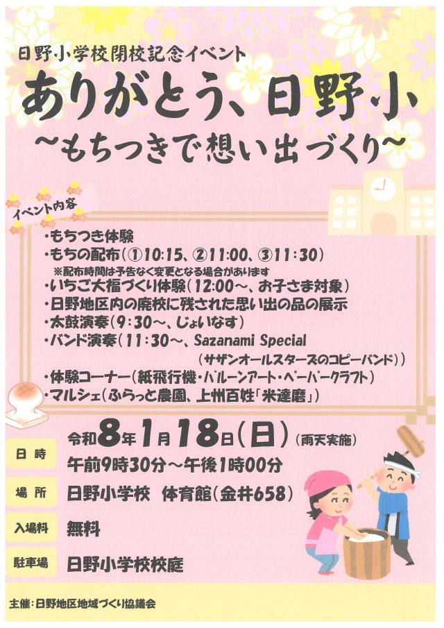 1月18日(日)、日野地区地域づくり協議会の主催で日野小学校閉校記念イベント「ありがとう、日野小~もちつきで想い出づくり」が開催されました。写真が整い次第、当日の様子を報告いたします。今しばらくお待ちください。