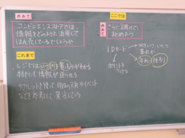 5年生は、社会で「情報を生かす産業」について学習しています。今日は、前の時間に調べ始めた「コンビニエンスストアではどのように情報を活用して商品を販売しているのか」についてさらに調べを進めていました。教科書や資料集の図や表、写真などをもとに、真剣な表情で調べていました。身近なコンビニエンスストアの裏側でどんな情報活用が行われているのか‥‥‥とても興味を引かれる内容の学習でした。