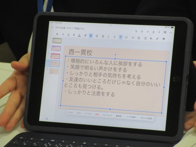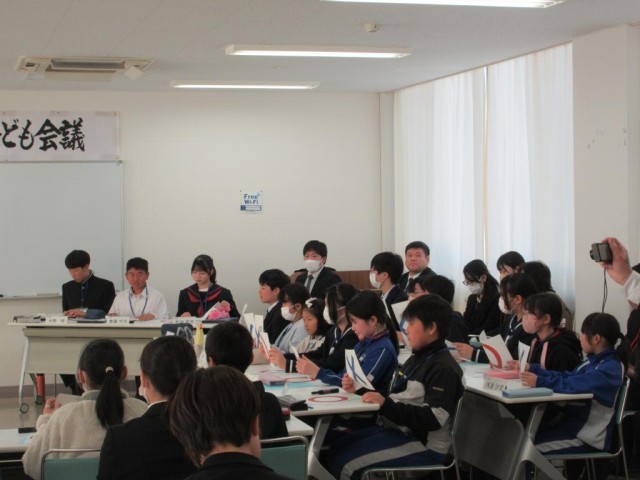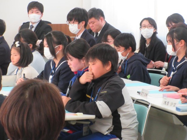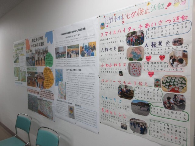 1/22の午後、市内の小中学生の代表が集まっていじめ問題解決に向けてどんなことをすればよいのかを話し合う「いじめ問題解決に向けた子ども会議」が開かれ、日野小からも56年生の代表が1名ずつ参加しました。全体での会議の後、校区別にどんなことをすればよいかを話し合い、その成果を代表の中学生が発表してくれました。この後、校内でもその成果を共有し、いじめが起こらないために子どもたちが考えた取組を実践していきます。