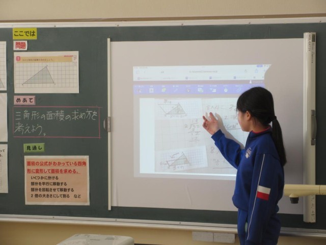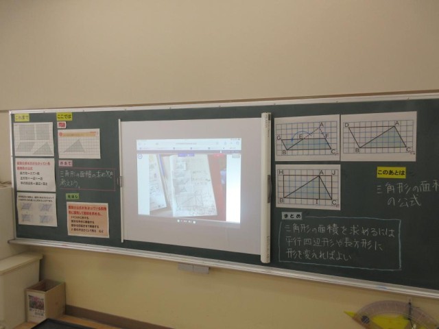 5年生は算数で三角形の面積を求める方法について学習しています。今日はこれまで学習した平行四辺形の面積の求め方を活用して、三角形を2つ組み合わせて平行四辺形をつくったり、三角形の一部を切り取りつなぎ合わせて平行四辺形をつくったりして面積を求めていました。途中オクリンクを使って、平井小の5年生の考え方と自分が考えた方法を比較する中で、長方形にもできることに気付けました。この授業は、校内研修の一環として先生方も参観しました。