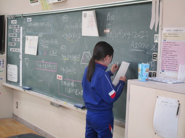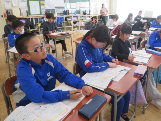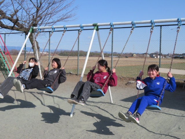 5年生の授業や休み時間の様子です。5年生も日野小学校の児童は1人なので緊張したと思いますが、算数の時間に前に出て黒板に問題の答えを書くなど頑張っていました。休み時間、平井小学校のお友達と一緒にブランコに乗っているときの笑顔がすてきでした。