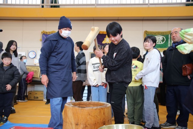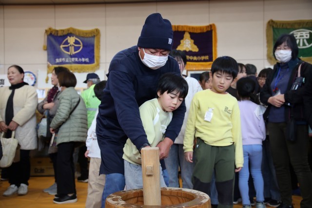 開会式後は、もちつき体験が行われました。最近の子どもたちにとって、臼と杵でもちをつく機会は少なく、大変貴重な体験となりました。日野小の児童だけでなく、来場した子どもたちも、それを見ている大人もとても楽しそうでした。まさに、「もちつきで想い出づくり」でした。