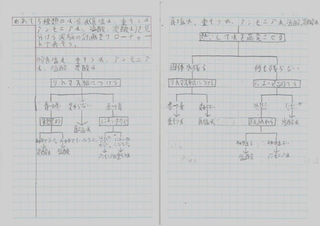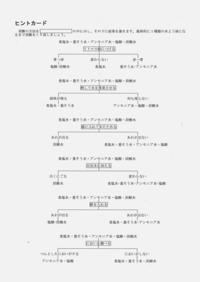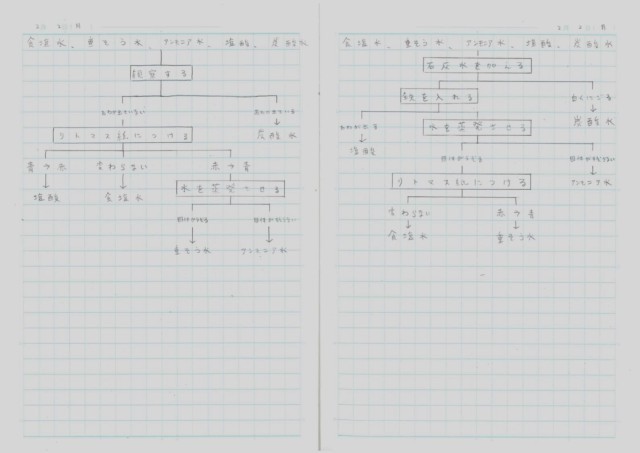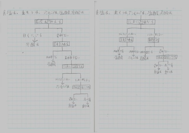5種類の水溶液A(食塩水・重そう水・アンモニア水・塩酸・炭酸水)を見分ける実験の計画をフローチャートで表しました。