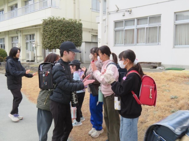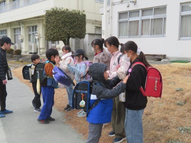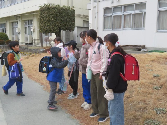 毎週月曜日はハイタッチを交わして下校する「スマイルハイタッチあいさつ運動」の日です。今日は女子が見送る側になって、ハイタッチをしながらあいさつを交わして下校しました。