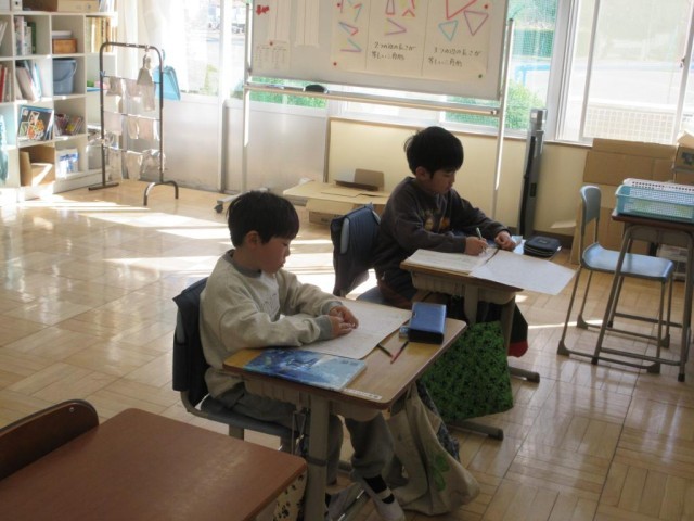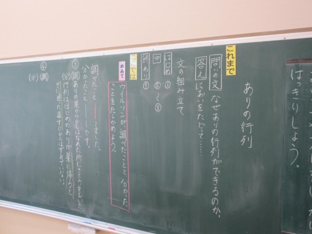 3年生は国語の説明文「ありの行列」でありの行列を調べていた人が、どのようなことを調べ何がわかったのかを読み取っていました。先生が一方の児童が答えたことについて、必ずもう一方の児童に確かめるなどきめ細やかに授業を進めていました。少人数ならではのよさかと思います。また教科書を拡大コピーして書き込みができるようにしていました。