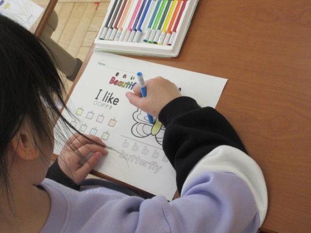 今日はALTの先生か来校して英語を教えてくれる日です。2年生は英語の絵本を手がかりに、お話の中に出てくる蝶々に色を付けて鮮やかにするためにどんな色を付けるか英語でやり取りしながら楽しんでいました。どんなカラフルな蝶々ができあがったのでしょうか。