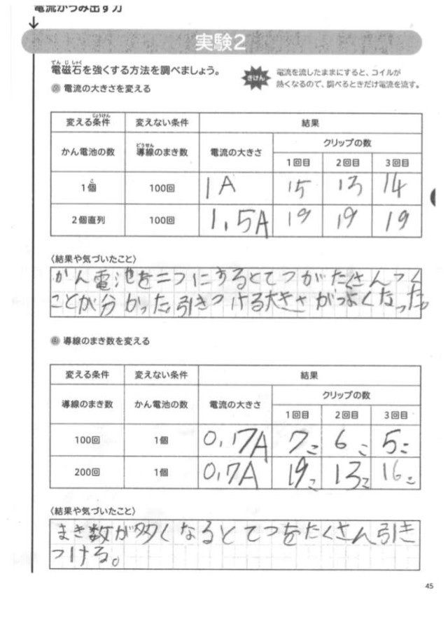 2/5 5年生 理科 公開日 2026/02/05 更新日 2026/02/05 できごと コイルの巻き数と電磁石の強さの関係を調べました。 コイルの巻き数が多いほど、電磁石が鉄を引きつける力は強くなることがわかりました。 コイルの巻き数が多ければ、乾電池1個でも人の体重を支えられるほど大きな力が生じることがわかりました。 +5