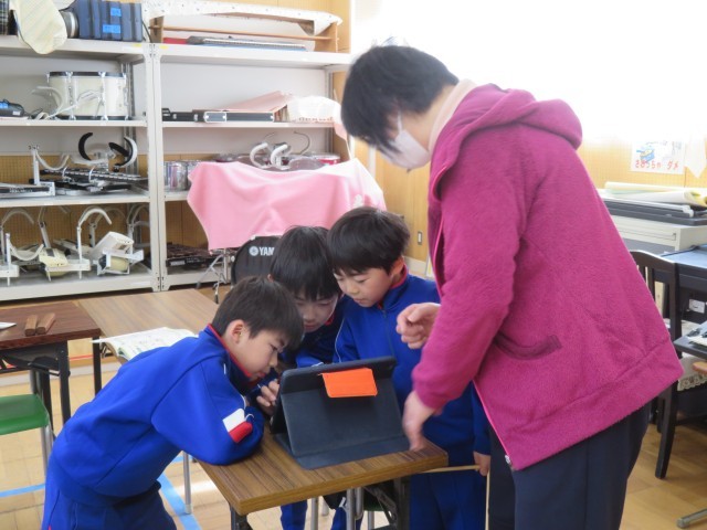 3年生は、音楽で音楽づくりに挑戦しています。今日は、どんな音楽をつくるのかを3人で相談していました。最初は、「ダイナミックな音楽」と「静かな音楽」という二つの意見が出ましたが、互いが意見を言い合い、調整して「静か→ダイナミックへと変わる音楽」をつくることになりました。次の音楽の時間に、実際に音楽をつくるそうです。カスタネット・トライアングル・木魚という三つの楽器の音でどんな音楽ができあがるのか、とても楽しみです。