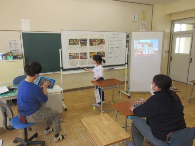 2年生は生活科で、1年間生活科で調べたりまとめたりしたことを発表しました。お店のことや生きもののことなどたくさんの発表をしました。先生がタブレットで以前の様子を撮影したものも一緒に放映したので、2年生が1年かけてとても成長した様子も見て取れました。保護者の方も一緒になって楽しんだ学習でした。