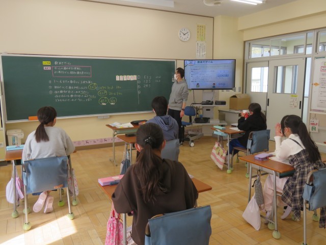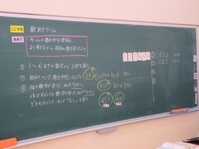 6年生は、算数で「数あてゲーム」に挑戦していました。1から6までのカードから3枚選んで3けたの数をつくり、相手がつくった数をあてるゲームです。つくった数と比べ、位と数字が同じものがあれば「ピタリ」、同じ数字を違う位でつかっている場合は「ヒット」、同じ数がなければ「なし」と伝え合うことを繰り返し、3つ全ての数字と位をあてます。参観した際には、「1ヒット」「2ヒット」などの言葉が聞こえてきました。果たして、正解にたどりつくことはできたのでしょうか。