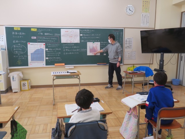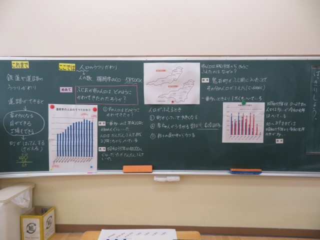 3年生は、社会科で「藤岡市の人口の移り変わり」について学習していました。副読本に載っている二つのグラフをじっくり見て気付いたことを、一生懸命ノートに書いたり、発表したりしていました。次の授業では、今日、グラフから読み取ったことをもとに、昭和59年と令和元年の年齢人口の変化から分かることについて考えていきます。昭和59年は0~29歳までの人口が多く、令和元年は30~89歳までの人口が多いということから、子どもたちはどんなことに気付くのでしょうか、楽しみです。