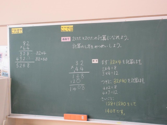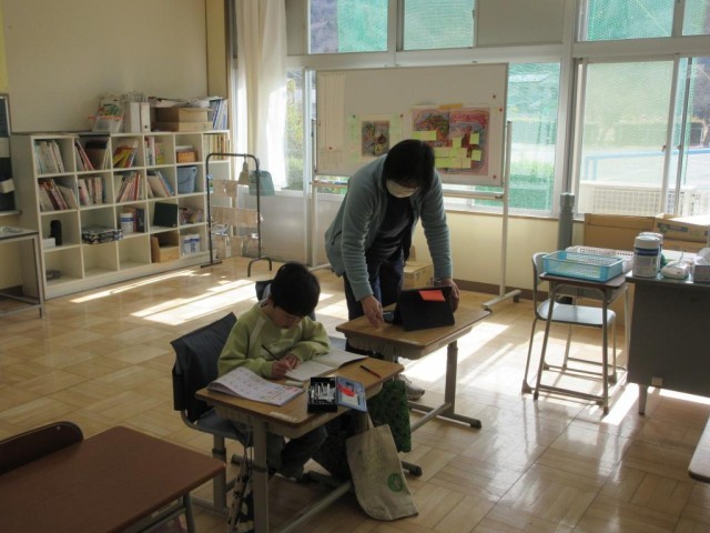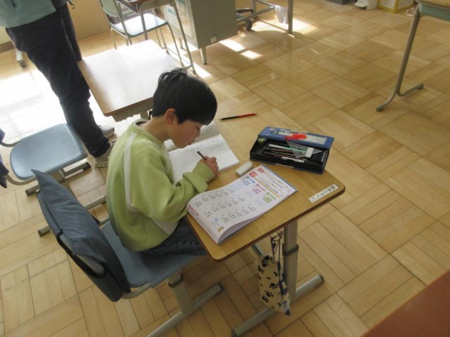 3年生は2けた×2けたの計算について、どのように考えればよいかを確認した後に、計算問題に取り組んでいます。今日は3年生は1人なので、算数はこれまでの復習や習熟の時間に充てています。四苦八苦しながらもきちんと計算できていました。