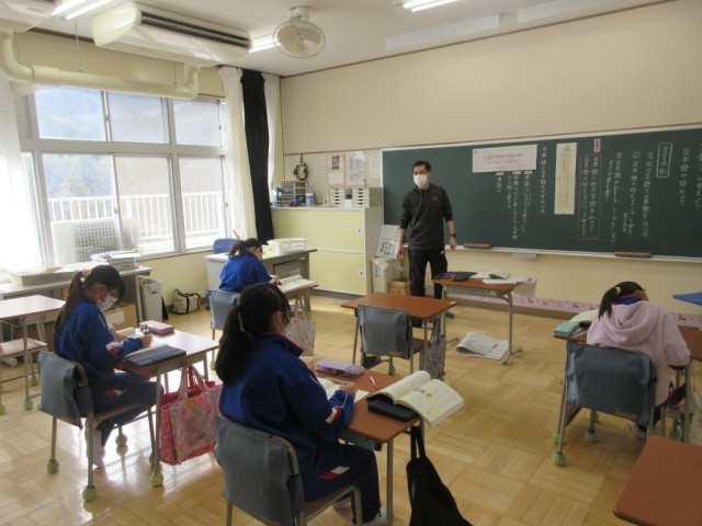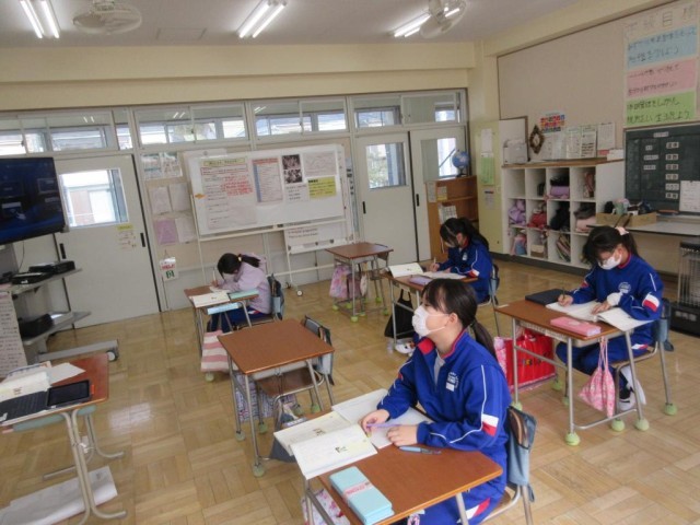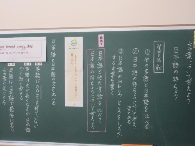 6年生は言葉について考える学習として、「日本語の特ちょう」について学習しています。今日は学校でも学習している英語と日本語を比較してどんな違いがあるかを考えています。「日本語で最後に言う言葉を英語では先に来ている」などの意見が出された後、「主語」「述語」「修飾語」などの言葉を使いながら、英語と日本語の違いについて学んでいました。また教室の掲示に社会科の戦後日本のことについて、課題に対する答えをまとめていく表がありました。課題のまとめと、次の課題への見通しを持たせていました。
