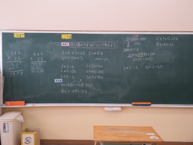 3年生は、算数でかけ算のきまりについて考えていました。3×2と3×20、3×2と3×200、3×2と30×2といった二つの式を比べ、そこにどんなきまりがあるかを先生や友達と対話を重ねながら見出していきました。そして、自分たちで「かける数やかけられる数を10倍にすると答えも10倍になる」とまとめることができました。自分たちの言葉でまとめた内容は、きっとしっかり身に付きますね!