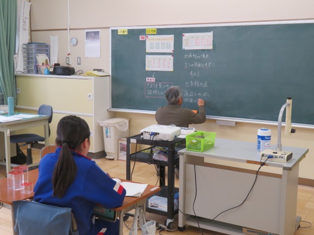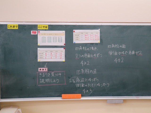 5年生は、算数で立体の特徴について調べています。今日は、角柱の頂点、辺、面の数からきまりを見付けていました。立体の模型も使いながら、角柱の面の数は、三角柱なら側面3+底面2で5、四角柱なら側面4+底面2で6、五角柱なら側面5+底面2で7‥‥‥と必ず底面2+側面であることなどに気付いていました。これらのきまりを使えば、十角柱などの頂点や辺、面の数もすぐに求められて便利ですね!