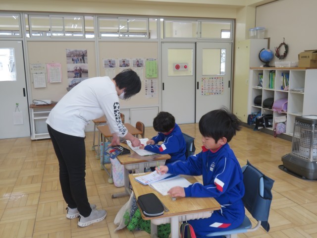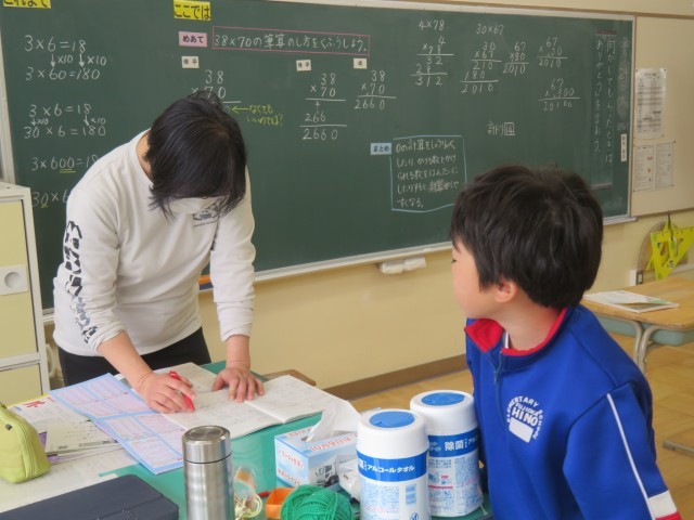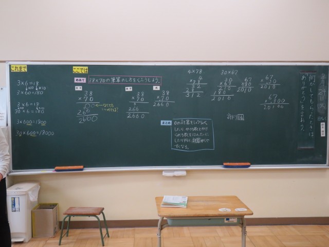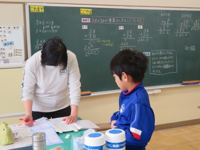 3年生は、算数の時間で「38×70」や「30×67」などの筆算の工夫について考えていました。そして、友達や先生と対話を重ねる中で、0の計算を省略したり、かける数とかけられる数を反対にすると計算しやすくなることに気付いていきました。まとめの後は、練習問題に挑戦。先生に丸付けをしてもらい、間違えたところはしっかり直していました。この積み重ねが力になっていくのですね!