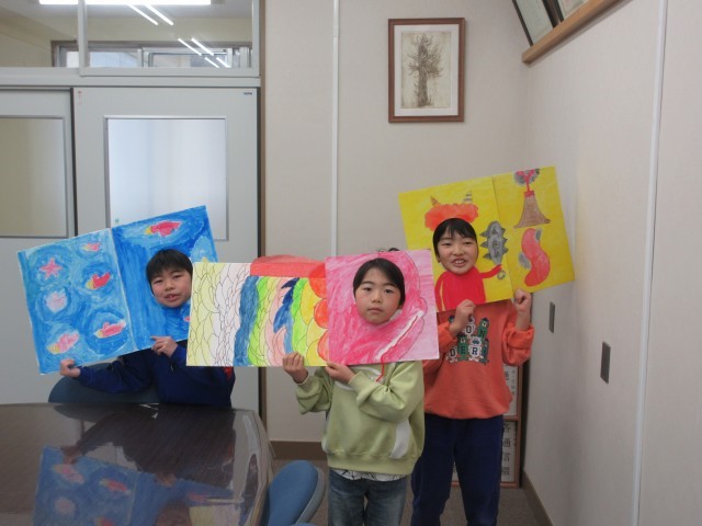 3年生が図工でつくった「顔を出したらなんだかワクワク」の作品を見せに校長室に来てくれました。3人とも工夫を凝らした作品ができ、満足そうでした。