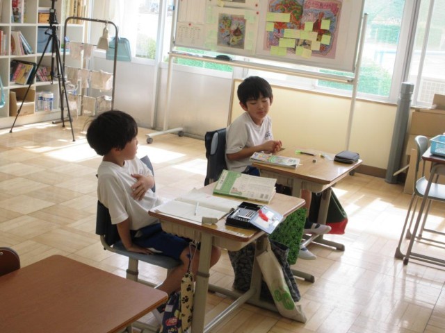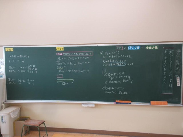 3年生は算数で「いくつ分」をもとにしたかけ算の学習をしています。もととなる数のいくつ分が全体量になることを理解し、かけ算で全体の数を求める学習です。このことが後々の「単位量あたりの大きさ」の学習につながっていきます。3年生は来週平井小でいっしょにそろばんの学習をします。先生から説明を受けていましたが、ちょっぴり心配そうでした。「専門の先生が優しく教えてくれるから大丈夫」というお話を聞いてほっとしたようでした。