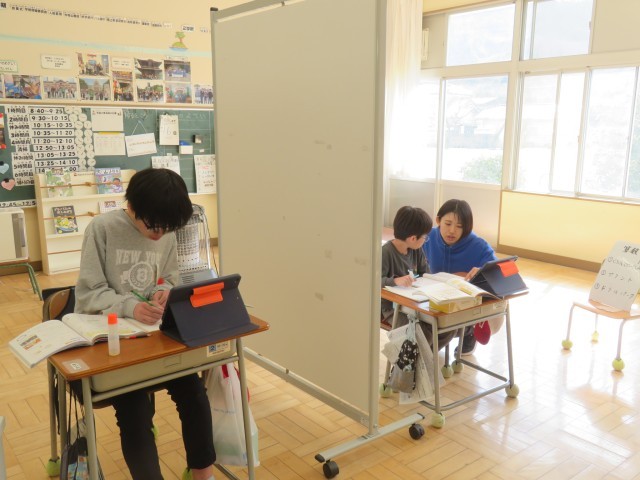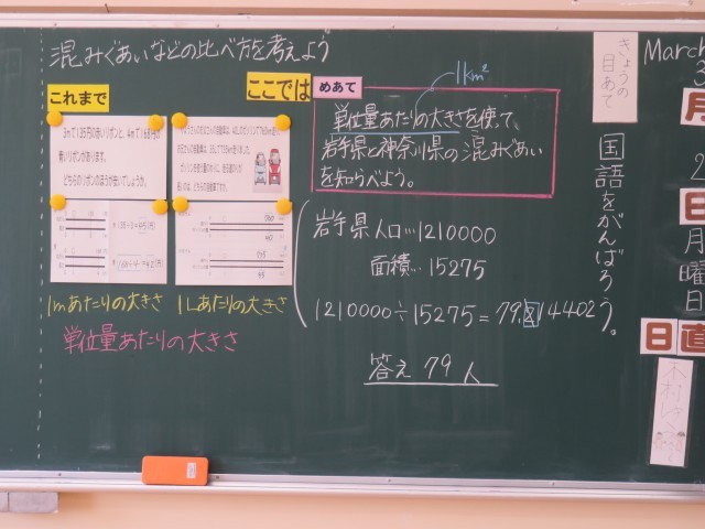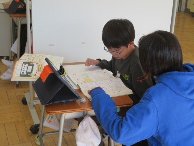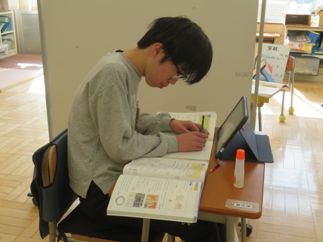 みかぼ学級は、算数の時間でした。3年生は、教科書の問題を解きながら、分かりやすく整理するためにはどうしたらよいかを考えていました。6年生は、単位量あたりの大きさを使って岩手県と神奈川県の人口密度を比べていました。タブレットも活用しながら、二人とも集中して学習に取り組むことができました。