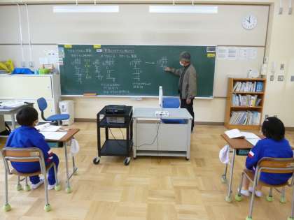 算数では、わり算の筆算の仕方をさらに考えようというめあてのもと、0を商に立てたときの計算を省略するやり方を学習していました。一つ一つの計算を丁寧にやりたいと思った子どもたちも、計算が便利になることに気付き、その後の練習問題にも意欲的に取り組んでいました。