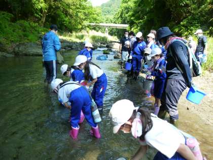 5月19日(木) 鮎川稚鮎放流事業に参加(4) 公開日 2022/05/19 更新日 2022/05/19 できごと 各自のバケツに稚鮎を分けていただき、いよいよ放流です。バケツを上流に向けて川にいれ、稚鮎の旅立ちを見守ります。体長15センチメートルほどの稚鮎は、川に投入されると勢いよく泳いでいきます。