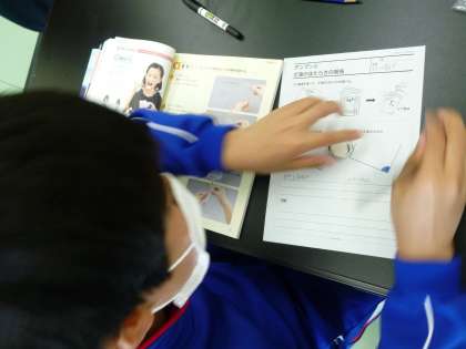 6年生は、人の体のしくみとはたらきについて学習しています。今日は「ご飯は、口の中で唾液と混ざるとどうなるか」について実験していました。唾液の働きによってご飯のでんぷんがほかの物質に変わることを、ヨウ素液を使って色の変化を見て学び、なぜそうなるのかと、次につながる疑問をもちました。