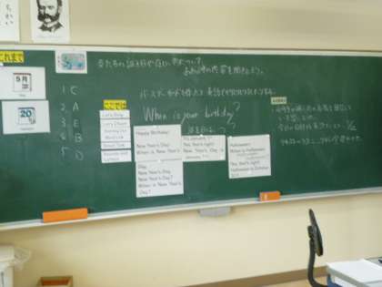 5月20日(金) 5年生外国語の授業 公開日 2022/05/20 更新日 2022/05/20 できごと 今日の外国語の授業では、「友だちの誕生日や欲しいものについて、おおよその内容を聞き取ろう」というめあてをもって学習に取り組みました。ハロウィーンやクリスマス、お正月などのことが紹介された歌を先生たちといっしょに歌い、バースデーカード作りなどに挑戦しました。最後の振り返りでは、4年生の時に学習した月の名前などが役立った、とこれまでの学習を生かせたことが述べられました。