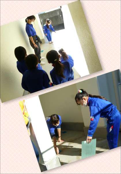 太陽の光について学習している3年生。今日の授業では、鏡で跳ね返した日光の進み方を調べました。校舎脇の通路の日が差している場所に鏡を置き、跳ね返した日光を受け止める下敷きを動かしながら進み方を調べ、記録しました。子どもたちは、興味を持って集中して取り組んでいました。