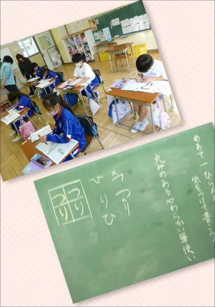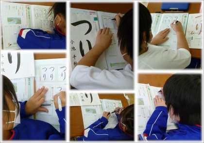 今日は、ひらがなの筆使いに気を付けて「つり」という字に挑戦しました。丸みのある柔らかい筆使いで書けるようにするため、お手本を何度もなぞってイメージをもってから鉛筆やフェルトペンで練習しました。3年生の集中力はいつもながら素晴らしく、少しずつめあてに迫っていきました。