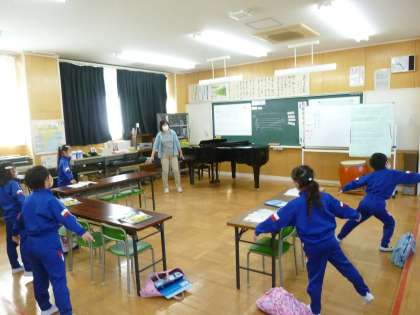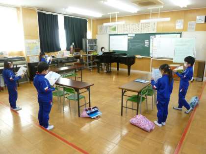 11月24日(木) 3年生音楽の授業 公開日 2022/11/24 更新日 2022/11/24 できごと 今日の授業では、『とんび』の歌唱練習に取り組んでいました。とんびが大空をゆったりと舞うように、ピーヨロと高らかに鳴くように歌うには、どうすればよいかを考えました。日野小の空を飛んでいる様子を思い浮かべてみよう、体を動かして羽ばたいているようにしたらどうだろうと、子どもたちは意見を出し合いました。これまでに学習した音の強弱なども生かし、楽しそうに体を動かして『とんび』を歌っていました。