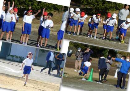 学年ブロックごとにウオーミングアップをし、最初は1・2年生の競技です。本校の2年生は少し緊張気味でしたが、担任・副担任の先生からエールをもらったおかげで、スタート時は1番の飛び出しでした。日野小の上級生や先生たち、保護者の皆さんの盛大な応援を受け、2年生は最後まで一生懸命走り抜きました。