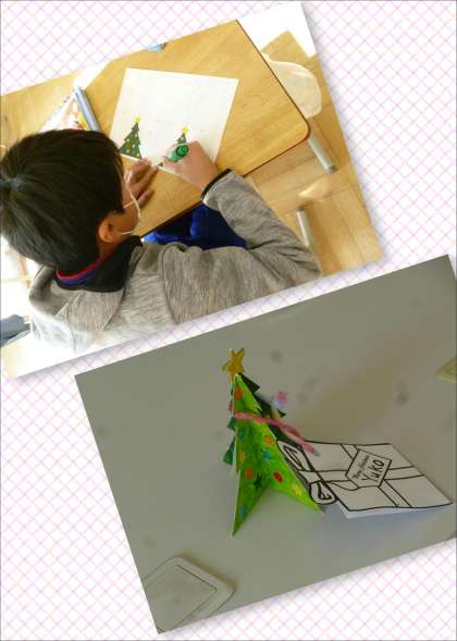 ツリー作りは、先生が用意してくれた型を切って折って色塗りをしてと、丁寧に取り組んでいました。クリスマスのことを思いながら、楽しい時間となったようです。