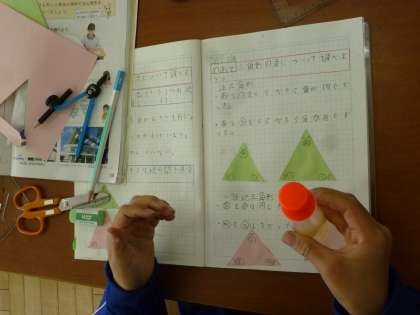 今日の授業では、三角形の角の特徴について調べました。先生の示す正三角形や二等辺三角形を定規やコンパスを使って色画用紙に書いて切り抜き、折ったり重ねたりして調べました。特徴をつかみたいと意欲をもち、積極的に取り組んでいました。