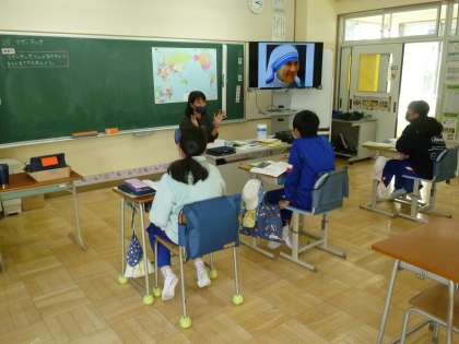 今日の授業では、マザーテレサさんの半生を視聴し、教科書を読んで生き方を知り、自分の今後について考えました。惜しみなく人道援助に生涯を捧げられたことはあまりにも偉大ですが、そのような生き方を知ることは子どもたちにとっても大きな意味があったと思います。