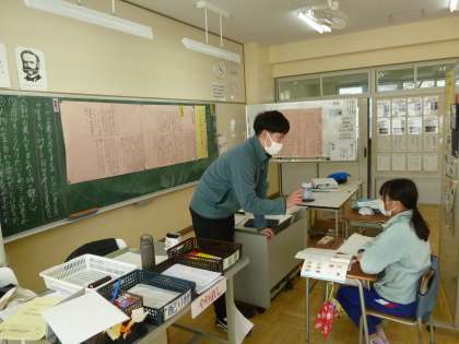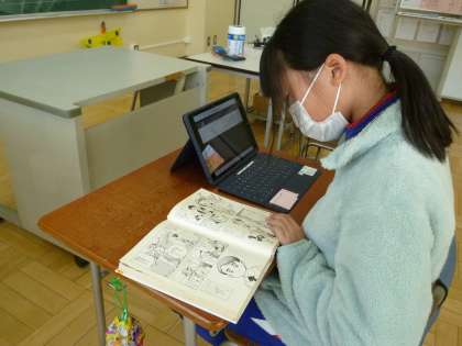 5年生は、『やなせたかし—アンパンマンの勇気』を学習しています。これまでの授業では、伝記に書かれた出来事とその時のたかしの気持ちや行動などを整理してきました。今日の授業では、たかしの生き方や考え方に対する自分の考えをまとめました。リモートで参加している児童も、教室からの先生や友達の呼びかけに応じて意欲的に取り組みました。