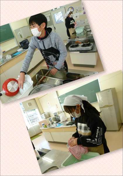 6年生は、今日の授業で調理実習を行いました。実習計画に基づき、野菜のベーコン巻き作りに挑戦しました。ベーコンで巻かれるにんじんやさやいんげんは、ゆでて下ごしらえをします。えのきだけも一緒に巻いてソテーにしたベーコン巻きは、とても美味しかったようです。試食後の調理用具や食器洗いなども丁寧にしたうえで、計画した時間通りに実習が終わりました。今回のメニューが家族の食卓に並ぶ日は、そう遠くないと思います。
