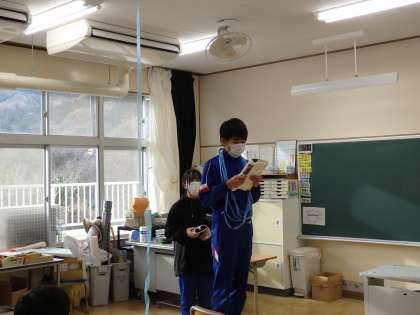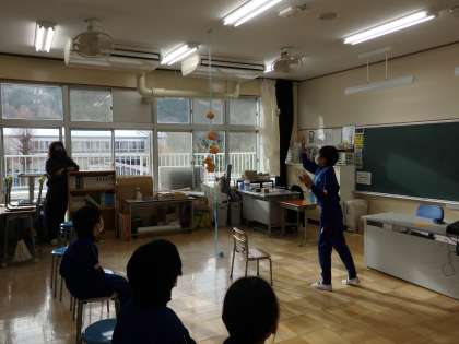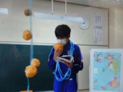 6年生は、国語の授業で狂言『柿山伏』を学習してきました。シテ(山伏)とアド(柿主)に分かれ、それぞれ目標をもって表現の練習をしてきました。今日は、その成果を下級生に向けて発表しました。天井からつり下げられた柿の木が、狂言の舞台をよく表していました。6年生は、難しい言い回しをスムーズに口にし、身振りも付けて、とても集中して演じました。