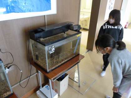 玄関に入ると、今度は水槽をのぞき込んでヤマメの様子を見ています。意図的に暗がりを作っていた黒いシートが外されて、横からもしっかり眺めることができます。子どもたちは「なんか大きくなったね」と、嬉しそうに話していました。