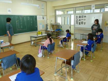 今日の授業では、手紙(葉書)の書き方について学習しました。手本をなぞり、おもて面の相手の住所、名前などの字の大きさを確認し、清書に挑戦しました。相手の名前が一行で収まるように書くことに苦労し、字の大きさや字間などを工夫する様子が見られました。